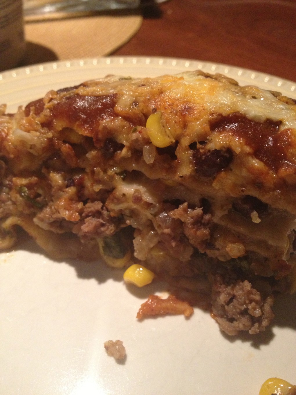Well, you make a pie instead! A smear of enchilada sauce on the bottom to keep it from sticking, then start layering. This is a ground beef , yes, using the beef from my cow. I added frozen corn, rice, black beans, lots of cilantro, onion, spices, hot sauce and salsa, and alternating pepper jack cheese with a mexican cheese mix. Pour a bottle of GF enchilada sauce over the top, bake and voila, dinner in a pinch!
