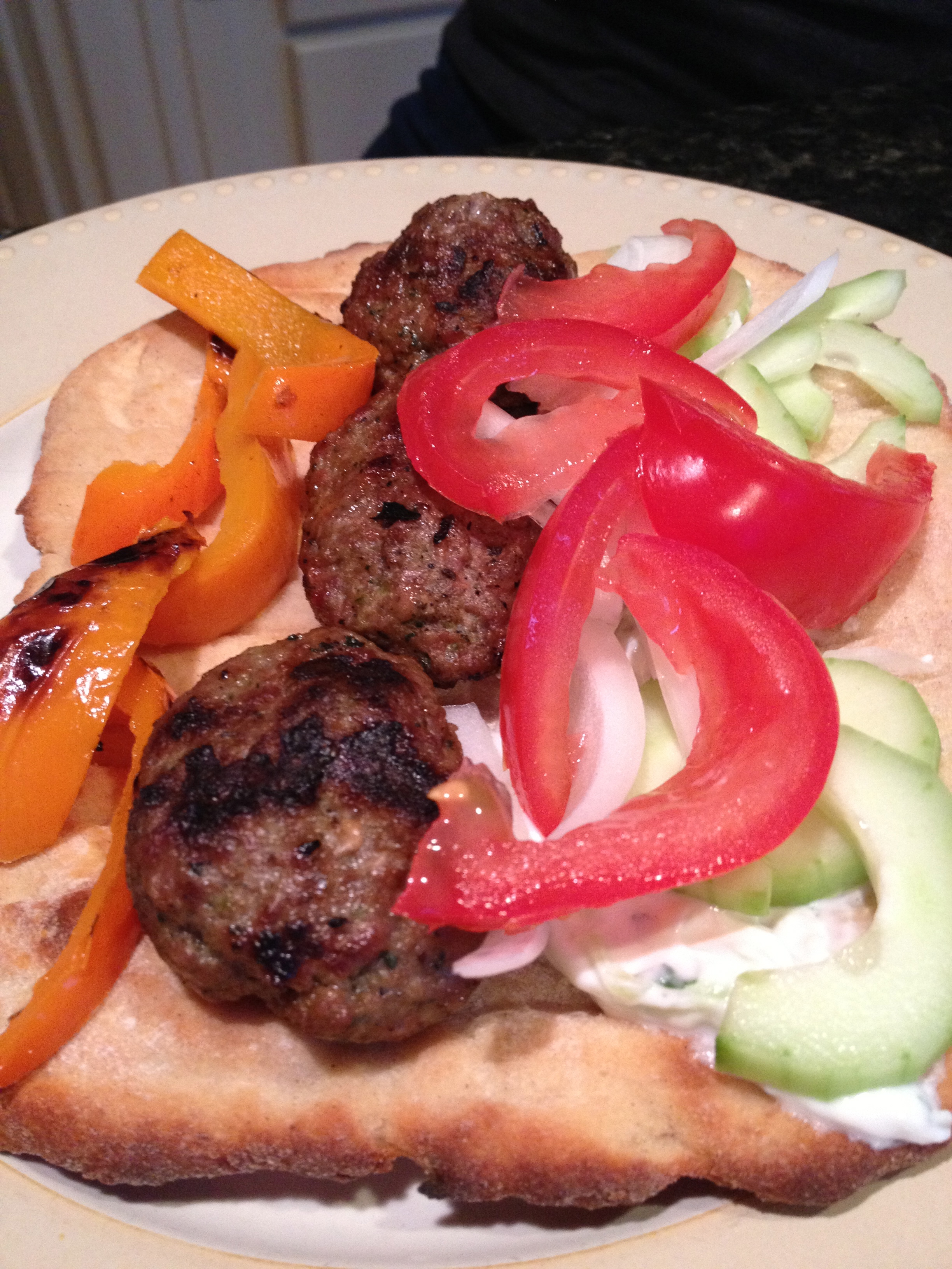 One of our favorite dinner meals are lamb kebabs done Moroccan style with tzatziki sauce (i was inspired by alton browns version, using greek FAGE yogurt), tomatoes, cucumber, white onions and grilled peppers. It hits all the main food groups so it’s a variation of a ‘one pot’ meal for sure. Perfect for a sunday sabbath day, cold outside but sunny and cheery. Not a bad day to experiment.