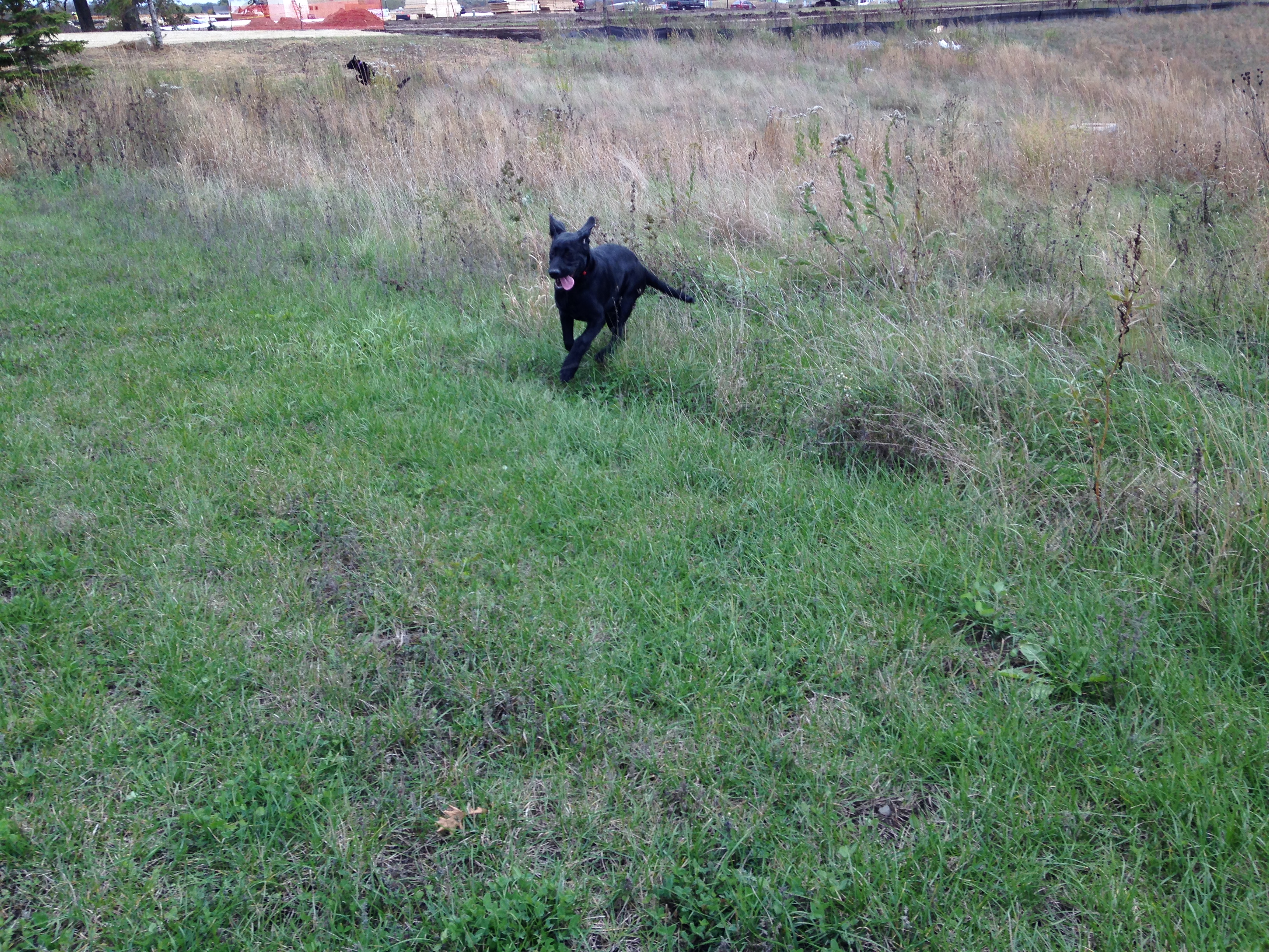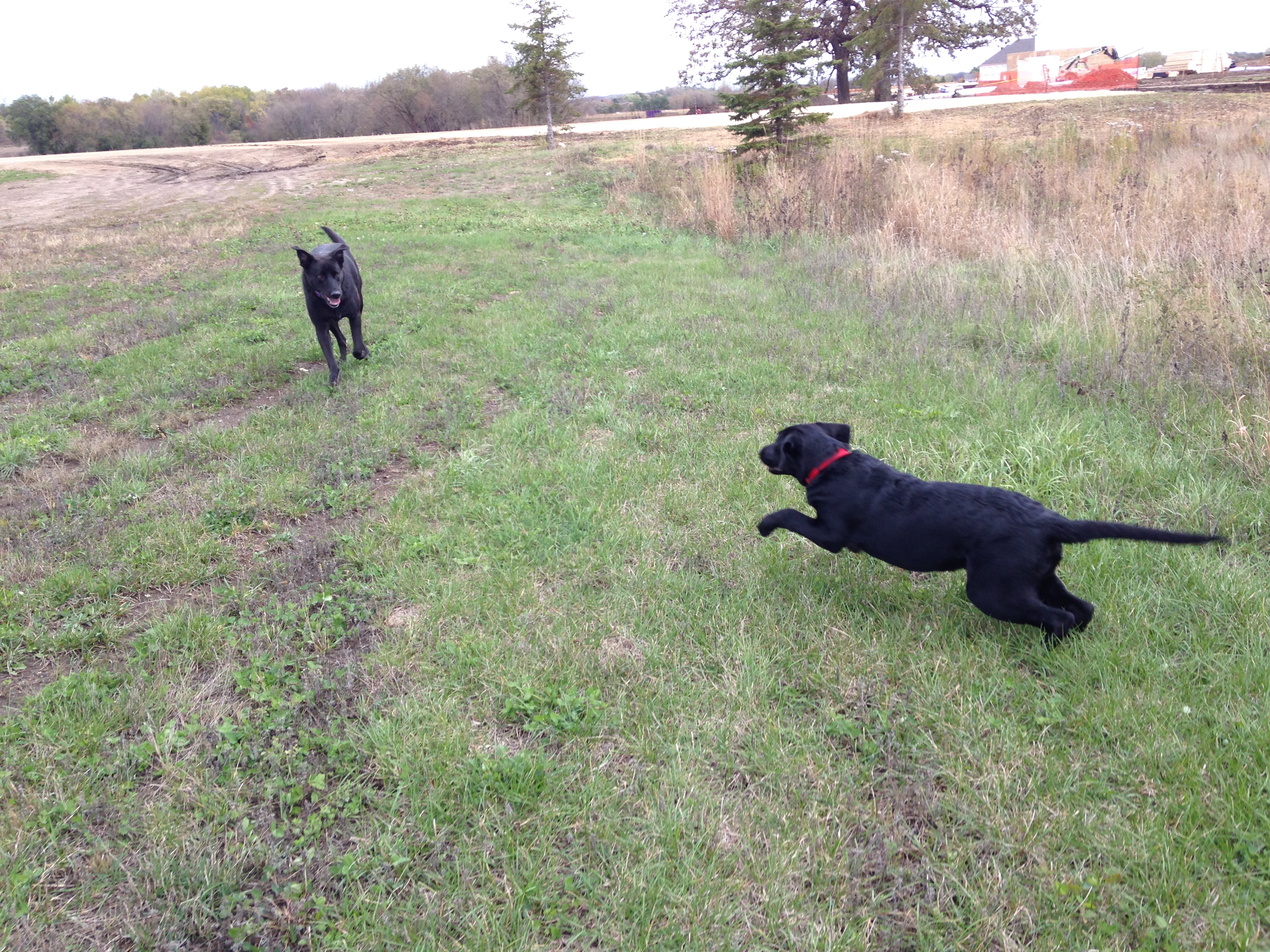 I change the routes occasionally, this time heading towards the soccer fields nearby, which borders on a closed sandpit the City has made a nature area. As a reward for walking on the leash nicely, I let them off leash to explore and run. (Puppies need to RUN)