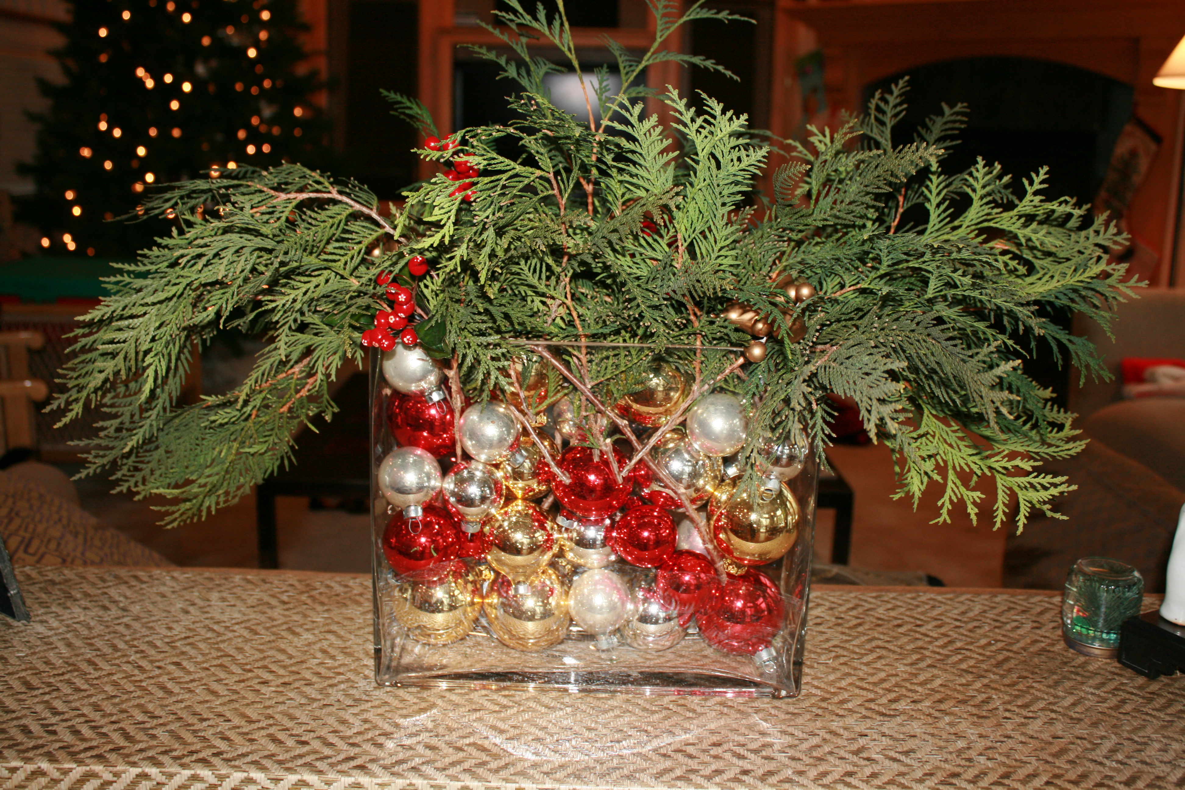 For the fall/Thanksgiving, I filled it with lemons and mini-pomegrantes. For christmas, I pulled out my vintage Christmas tree balls and headed out to my arbor vitae to clip some greens. A bit of decorative garnish and VOILA!