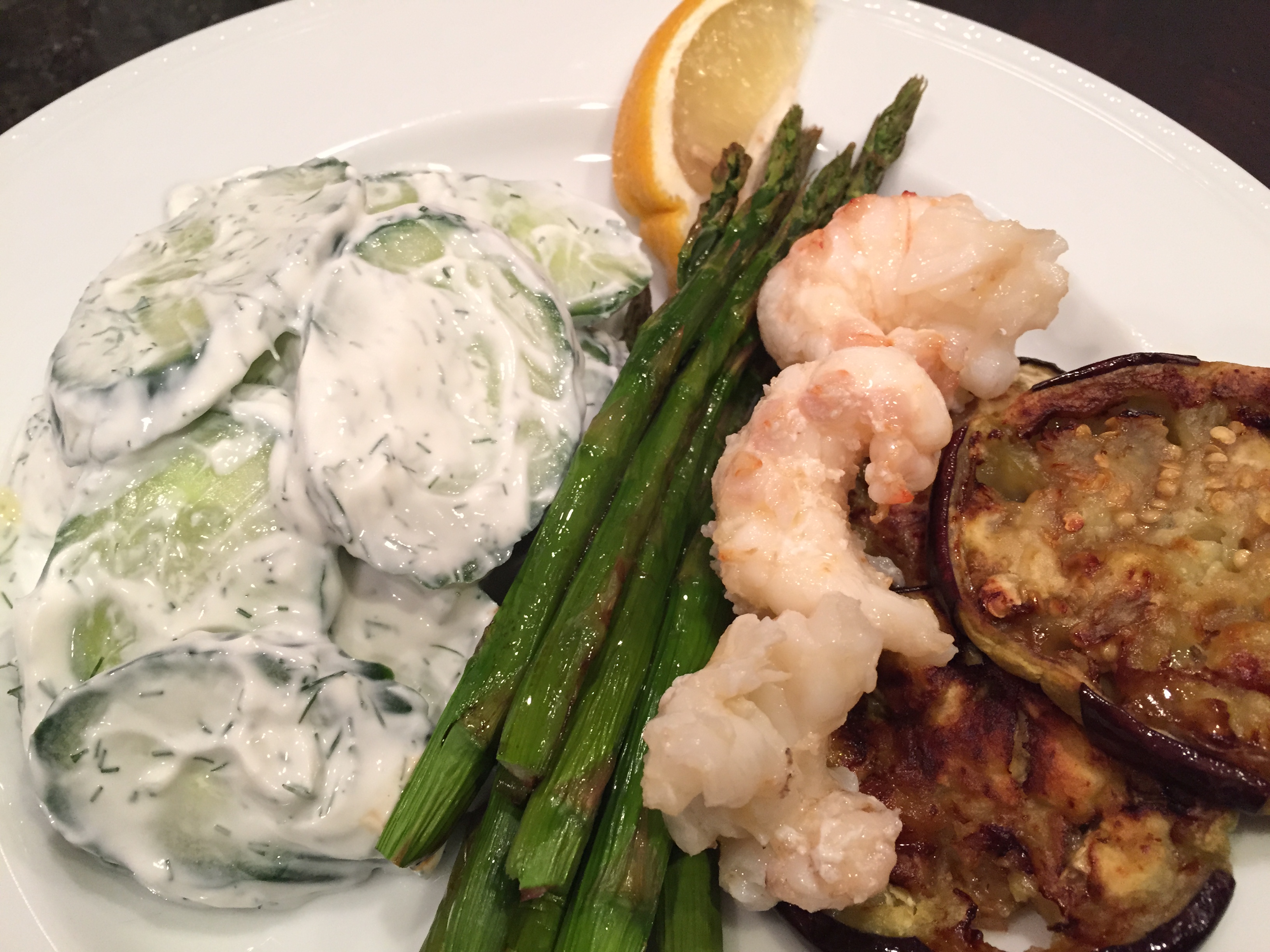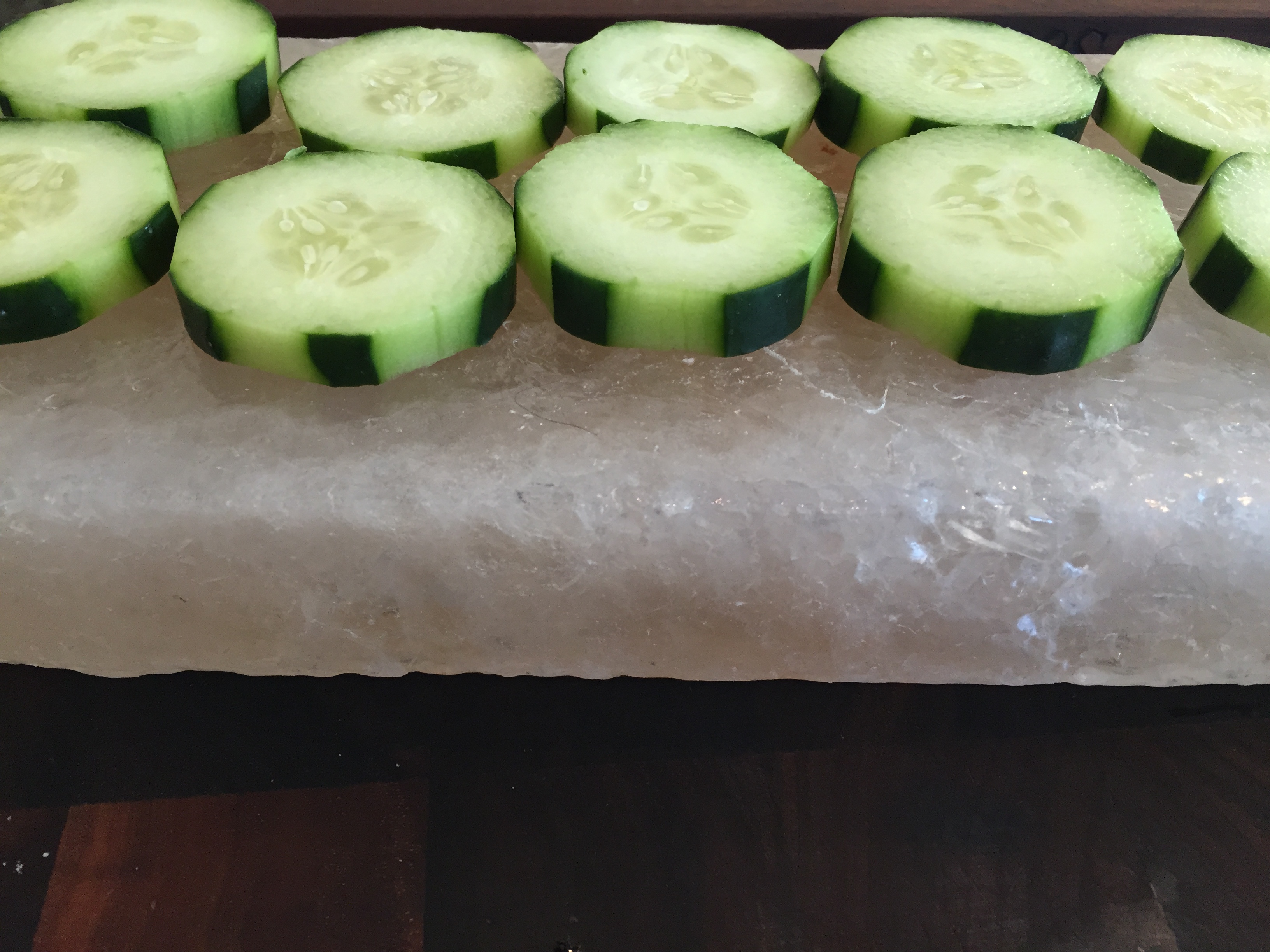 Slice your cucumbers and lay them on the block. Let them lay there no longer than a couple minutes on each side. (Not too long, they will get too salty) Pat dry, and then toss with Fage 0% Greek Yogurt, lots of fresh dill, cracked pepper and a splash of cream and/or lemon juice to loosen up.