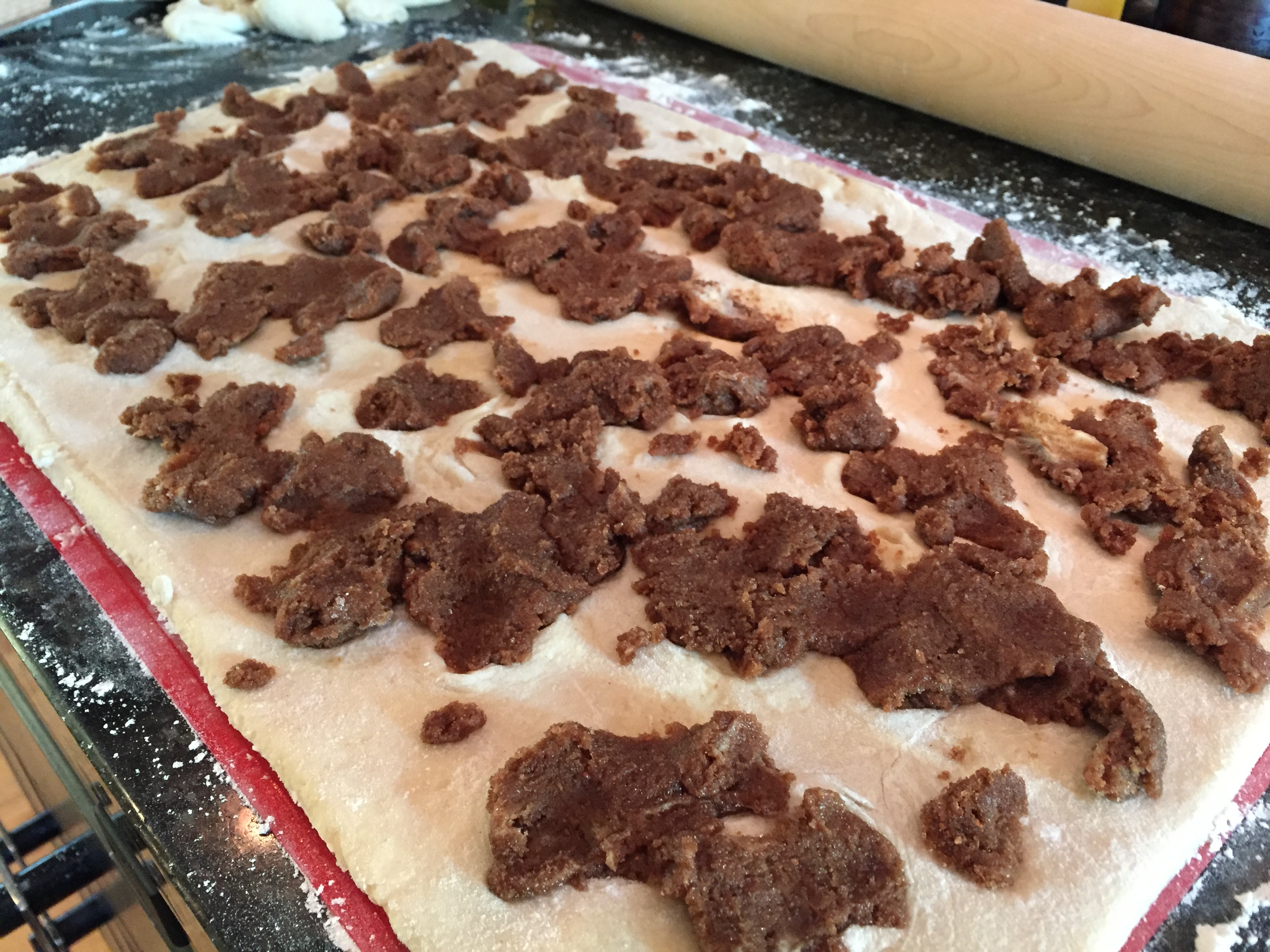 3. Unless you melt the butter (see #8 note below), getting the creamed butter to ‘spread’ over the dough rectangle just isn’t going to happen in a pretty way. Granted, its fall/winter and my kitchen is cold, but that dough is soft. I gave myself some grace and just tried to make it work by ‘smooshing’ the butter mixture into flattened wads and laid them over the top. (see photo below)