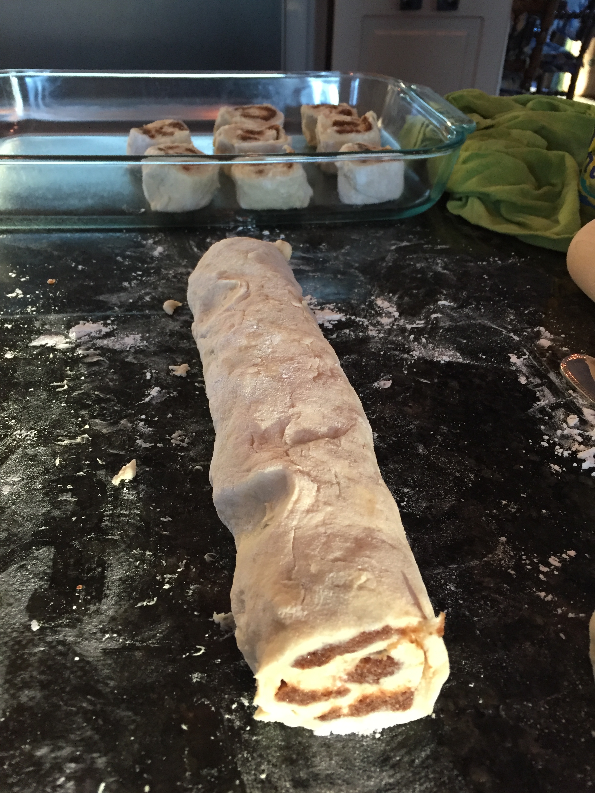 Here is the ‘fun’ part: rolling!  Pick up the long edge and gently begin to fold it over on the dough. You are rolling it into the shape of a log. If it is going to stick, this is where it will. Don’t panic, simply take a kitchen knife or bench scraper that has been dipped in your flour, and gently ease it off the mat and onto itself. Keep rolling. If you need to use a bit of flour to ease the rolling process, do it. When the whole thing is rolled up (photo above), pinch the seam together as best you can. Now is when your teeth cleaning skills come in to play….not really! Now is when you use your dental floss to ‘cut’ the dough. Lay it flat and slide it under the log. Then lift both ends up, cross them over and pull, it will cut off a 1.5 inch slice. Take the slice, and place it in your greased 9×13 dish, cut side up. Continue till all the dough is cut.