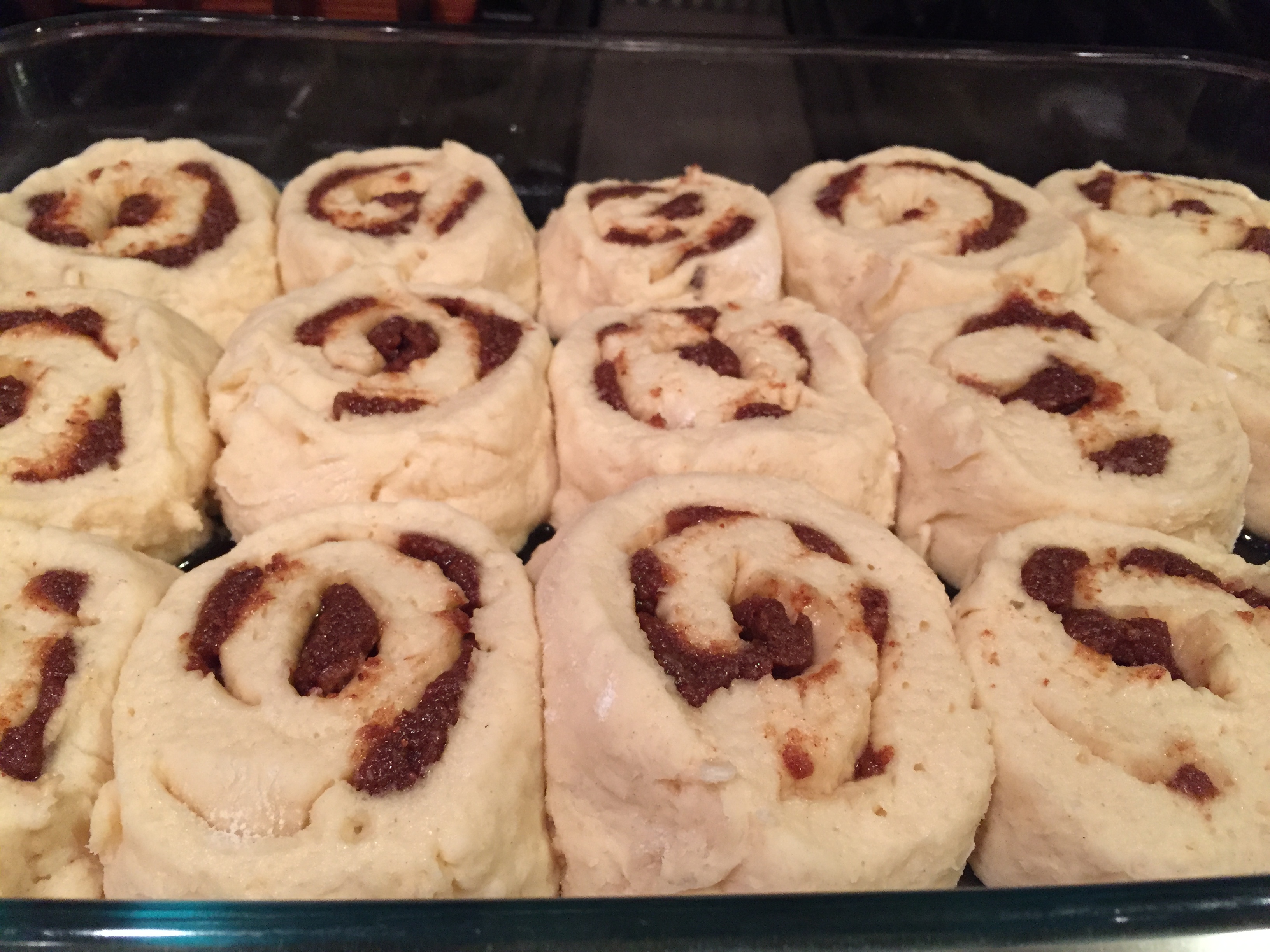 Cover the pan with saran wrap. I like to put a dish towel over the top and place it in the warmest spot in your kitchen. Since I usually have my oven going, near the oven is best. If that is NOT your case, then bring 4 cups of water to a boil, put a pan in your oven that will hold the water, and pour it in, place your rolls in, and shut the oven door! The warm water will warm up the air. You might want to check the warmth after about 45 minutes. (Rolls can take 45 min- 2 hours to rise, depending upon your kitchen temp) Re-heat the water if you need to.