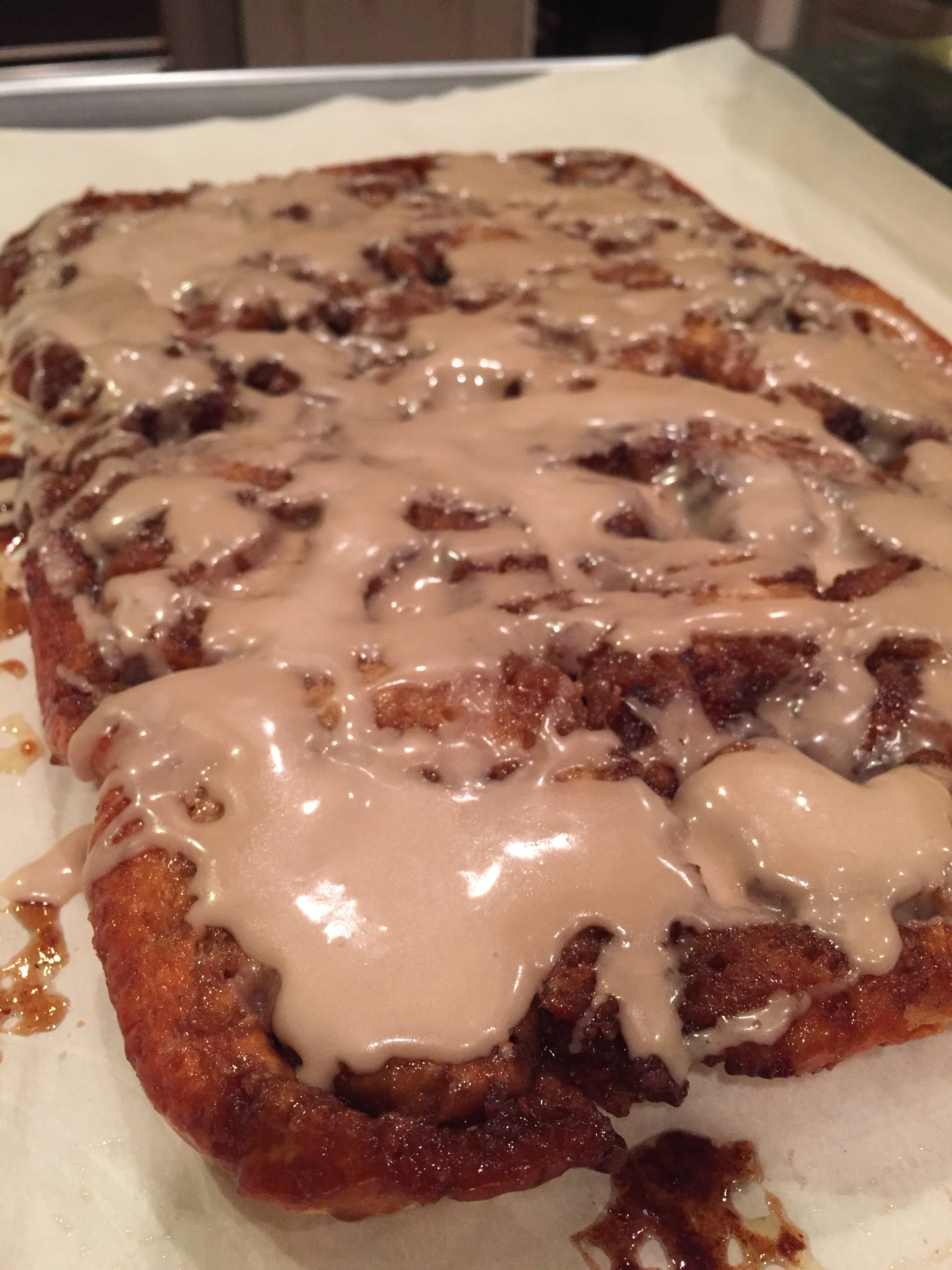Immediately upon removing from the oven, turn out onto a platter. Sounds easy? Yeah. I still find it intimidating! Here is the trick. I have a full sheet pan. (large lightweight platter works too) I place a piece of parchment on it. I take that sheet pan (or platter if you don’t have a sheet pan big enough) and I invert it onto the top of the hot baking dish.  Put on your oven mitts, and with one hand on the sheet pan, one on the bottom of the baking dish, flip. The rolls will slip right out.