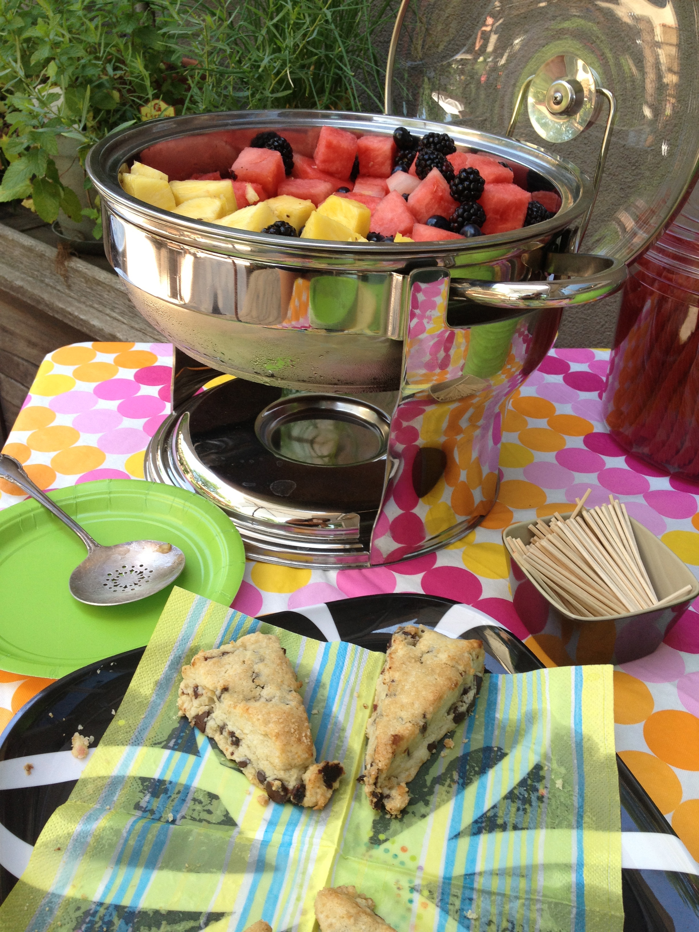 Her thought was to have an all day fun-fest poolside, starting at 10am going through the evening. So, for brunch, we started off with festive mango beverages, fruit salad and homemade GF scones.