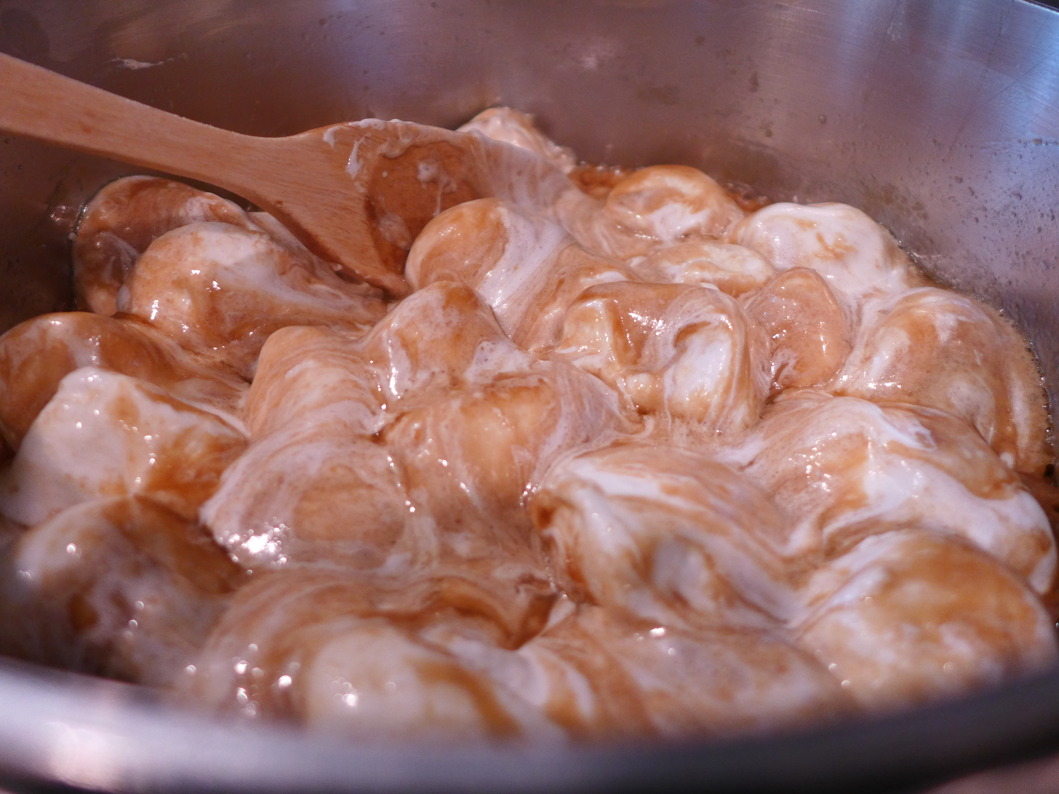 Note: If they are too warm, they will not stick together. Just wait another minute and try again. Keep your hands covered in butter to keep them from sticking to your hands-which can be frustrating!