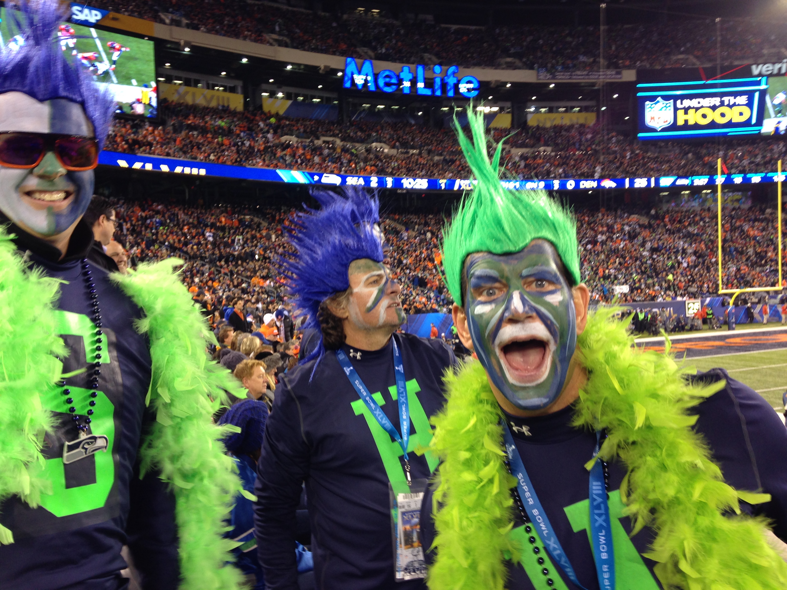 From the tailgate, we walked over to the stadium…us, and a mass of humanity moving the same direction. We found our seats, opened up the goodie bags attached to the seat cushions and settled ourselves in for the game. It was expected to be a nail biter, with the best defense playing the best offense. In all the Q & A’s, the general consensus (with the exception of Derrick Brooks who favored the Seahawks) was that the Broncos would (because of Manning and general team experience) beat out the Seahawks by a narrow 24:22. What I think no one, and I mean NO ONE, expected was the blowout that ensued. Since I was rooting for the Squawks, I had fun, as did these guys!