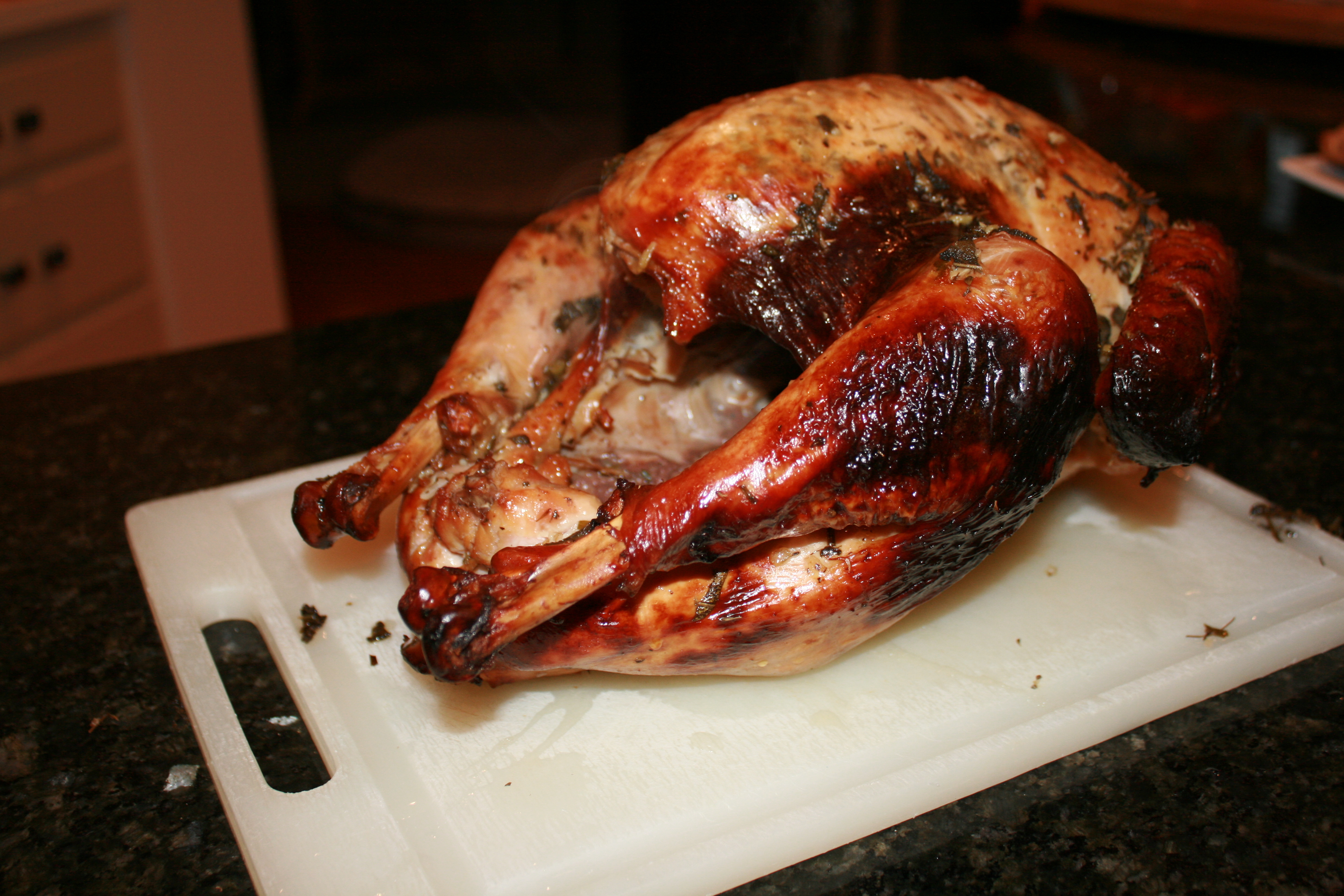 Many sites will tell you to cook the breast meat to 180 degrees. I use the pound/minutes guide but check it with my thermometer. I confess, I cook mine to 165-170 degrees, since in the resting process, the temperature in a large turkey will continue to rise 5-10 degrees. Since I cook a large 20 pound bird each year, I have found that temperature to be ideal and results in tender, not over-cooked slices. If you are inexperienced in cooking, err on the side of safety and cook the meat to 175. It WILL rise another 5 degrees as long as you keep it in a warm spot of the kitchen. If you don’t have a thermometer, cook according the charts pounds/minute and then prick the thigh meat. If the juices run clear, its done. The thigh meat takes longer than the breast, so this way you are ensured to have fully cooked meat.